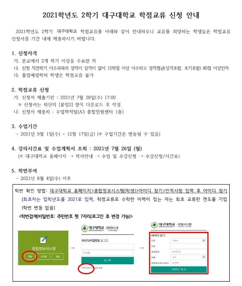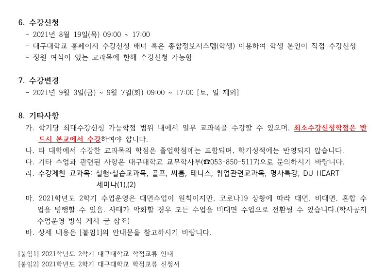 2021학년도 2학기 대구대학교 학점교류 신청 안내(수업기간,수강신청일자 변..