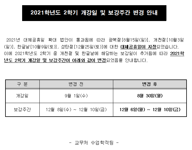 2021학년도 2학기 개강일 및 보강주간 변경 안내