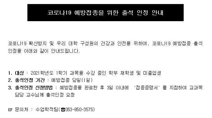 코로나19 예방접종을 위한 출석 인정 안내