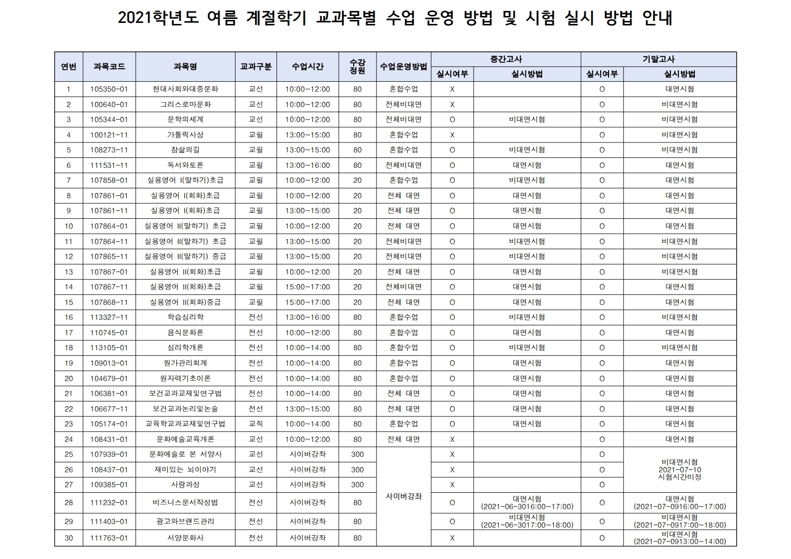 2021학년도 여름 계절학기 교과목별 수업 운영 방법 및 시험 실시 방법 안..
