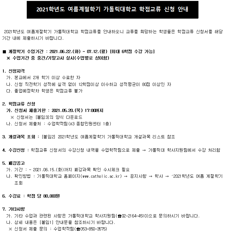 2021학년도 여름계절학기 가톨릭대학교 학점교류 신청 안내