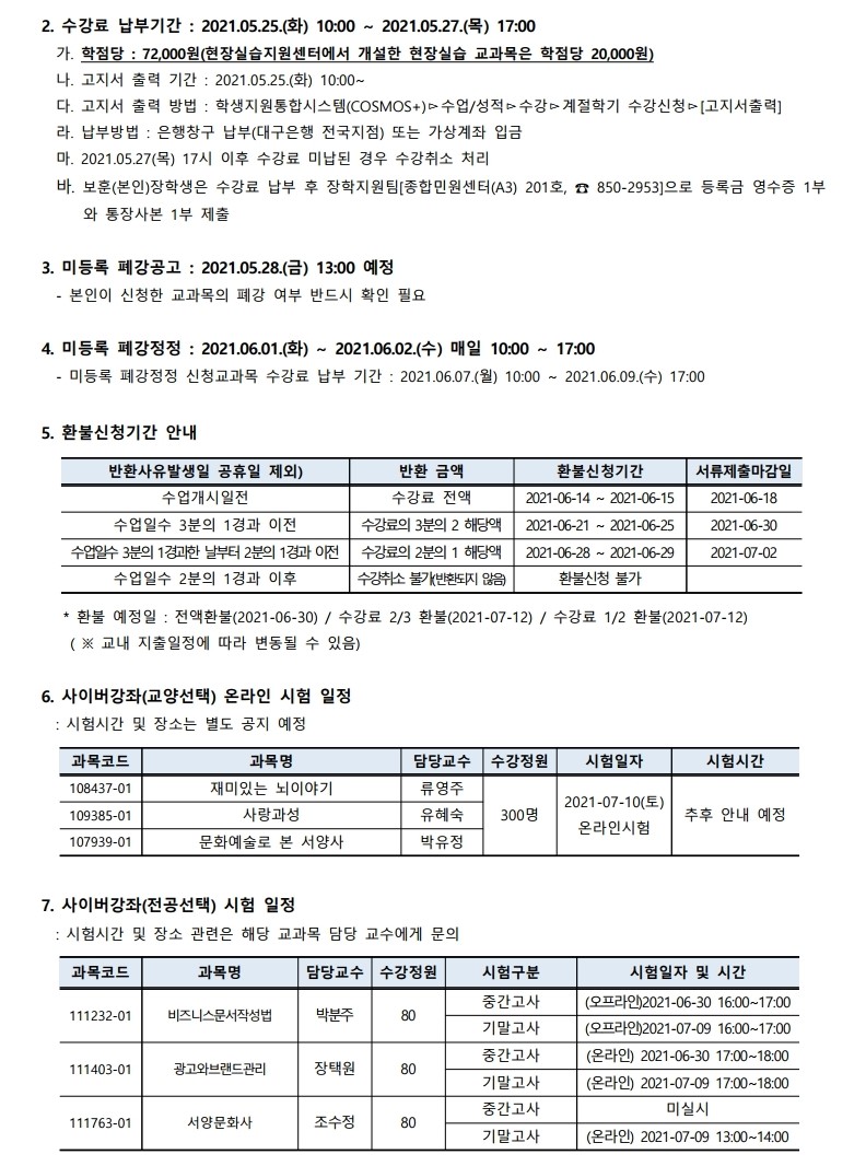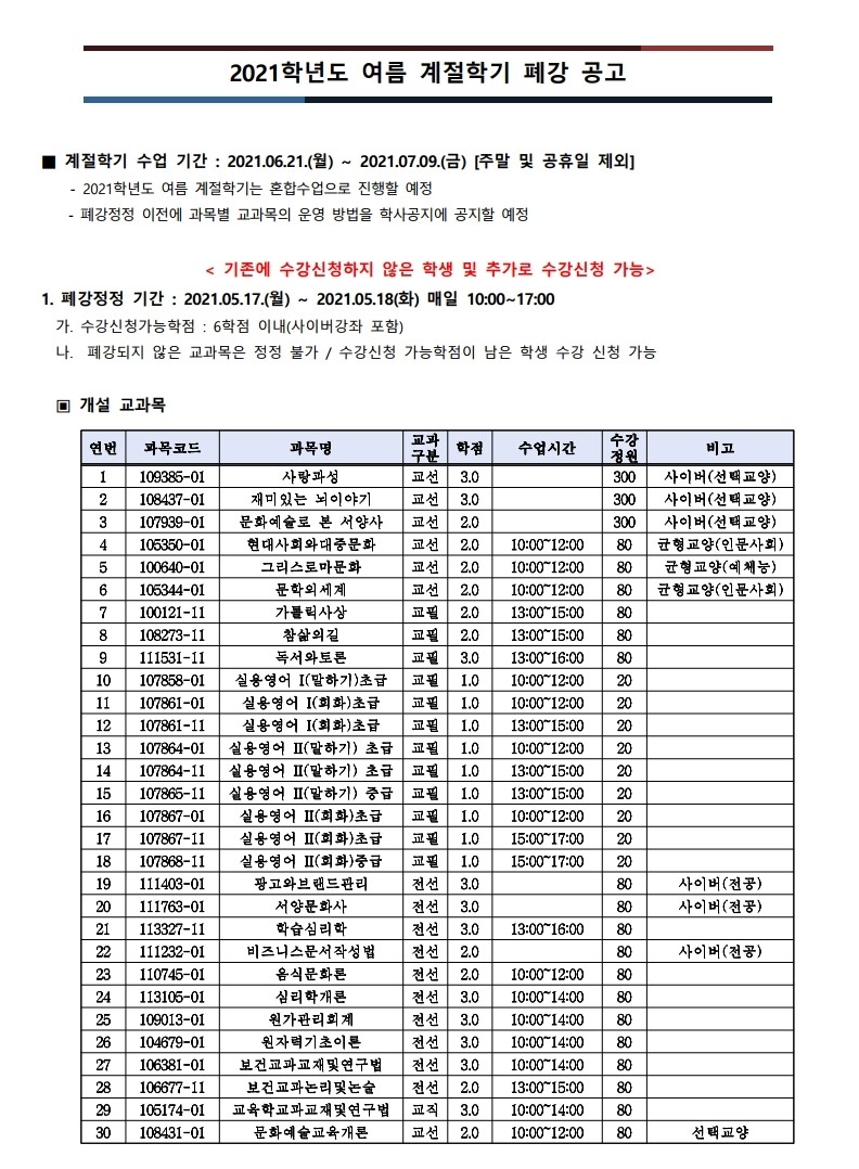 2021학년도 여름 계절학기 폐강 공고