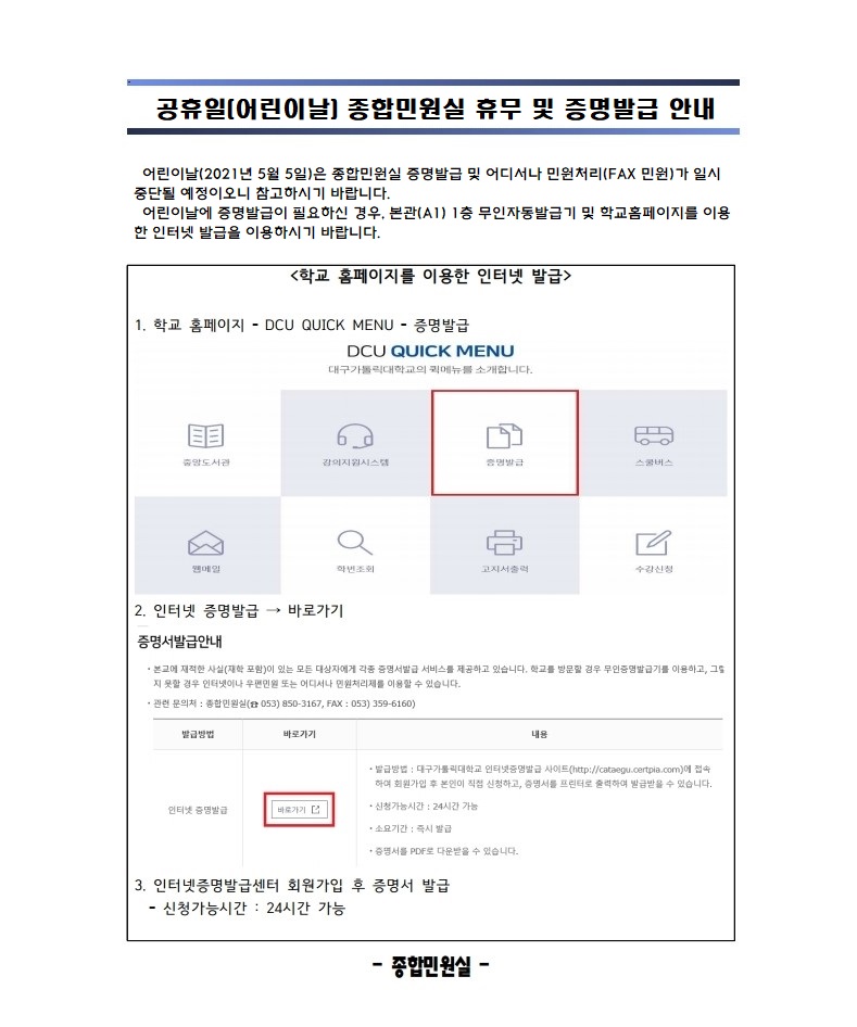 공휴일(어린이날) 종합민원실 휴무 및 증명 발급 안내