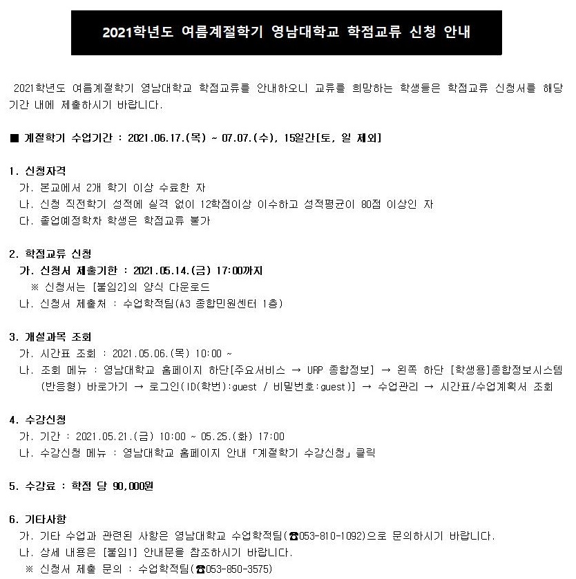 2021학년도 여름계절학기 영남대학교 학점교류 신청 안내