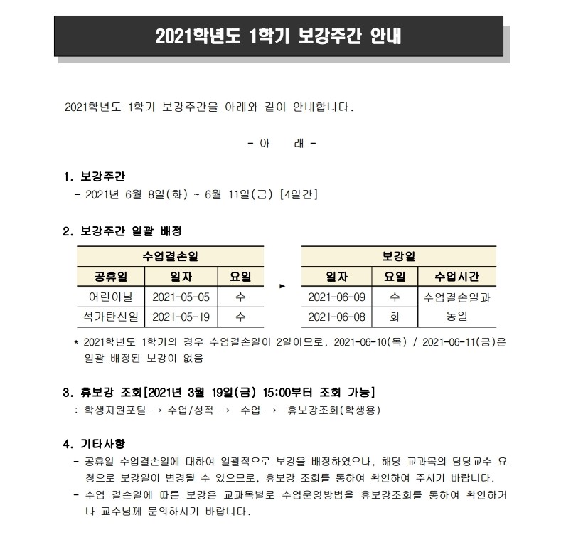 2021학년도 1학기 보강주간 안내
