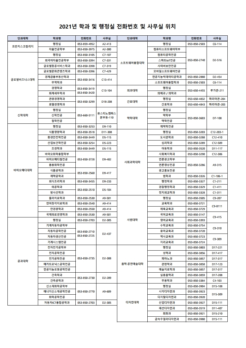 학과 및 행정실 전화번호 및 사무실 위치 안내