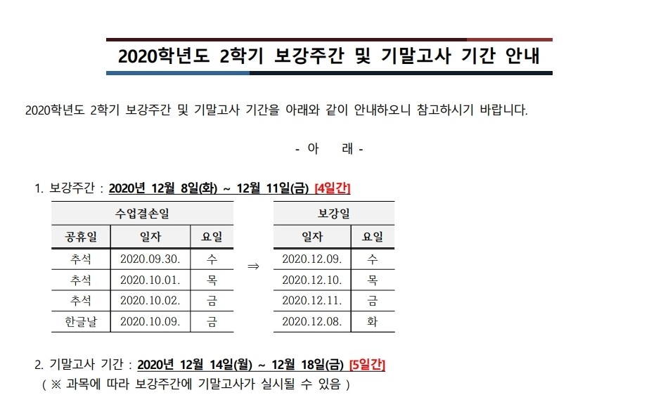 2020학년도 2학기 보강주간 및 기말고사 기간 안내