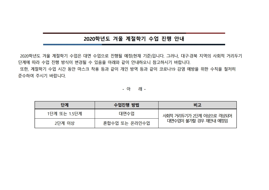 2020학년도 2학기 사회적 거리두기 단계별 수업진행 안내