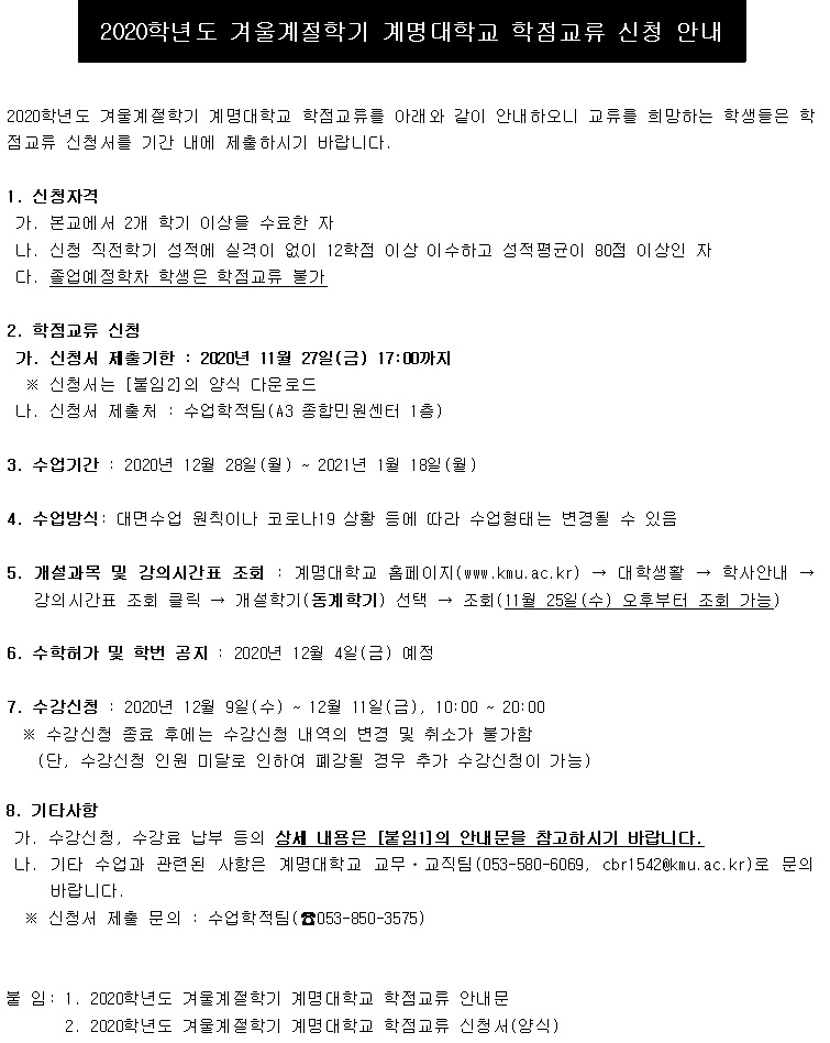 2020학년도 겨울계절학기 계명대학교 학점교류 신청 안내
