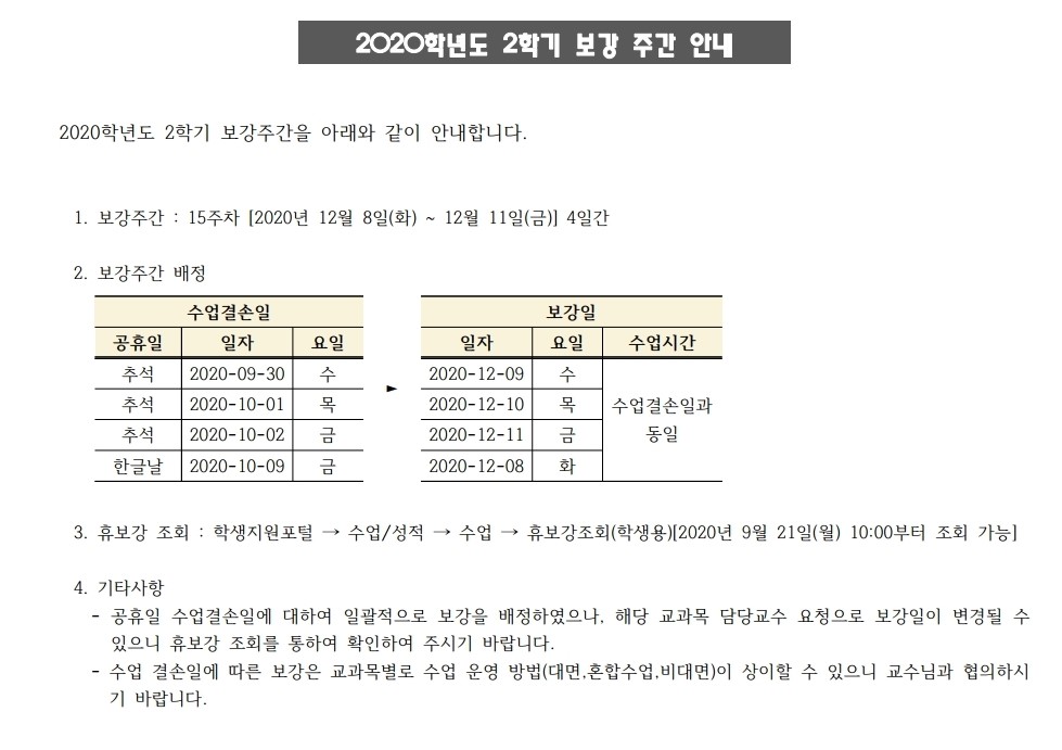 2020학년도 2학기 보강주간 안내