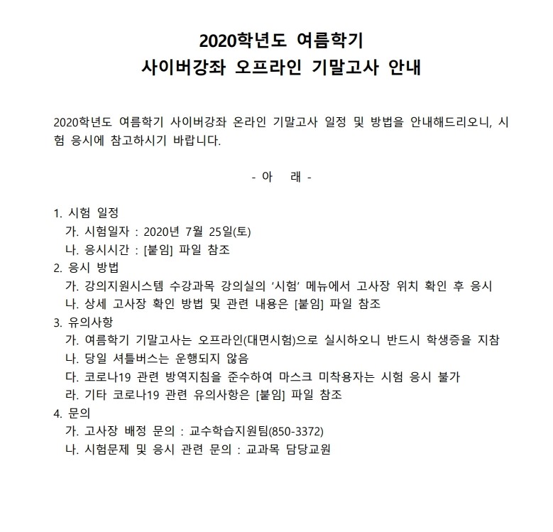 2020학년도 여름학기 사이버강좌 오프라인 기말고사 안내