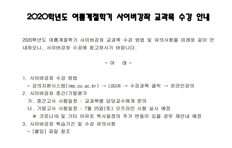 2020학년도 여름계절학기 사이버강좌 교과목 수강 안내