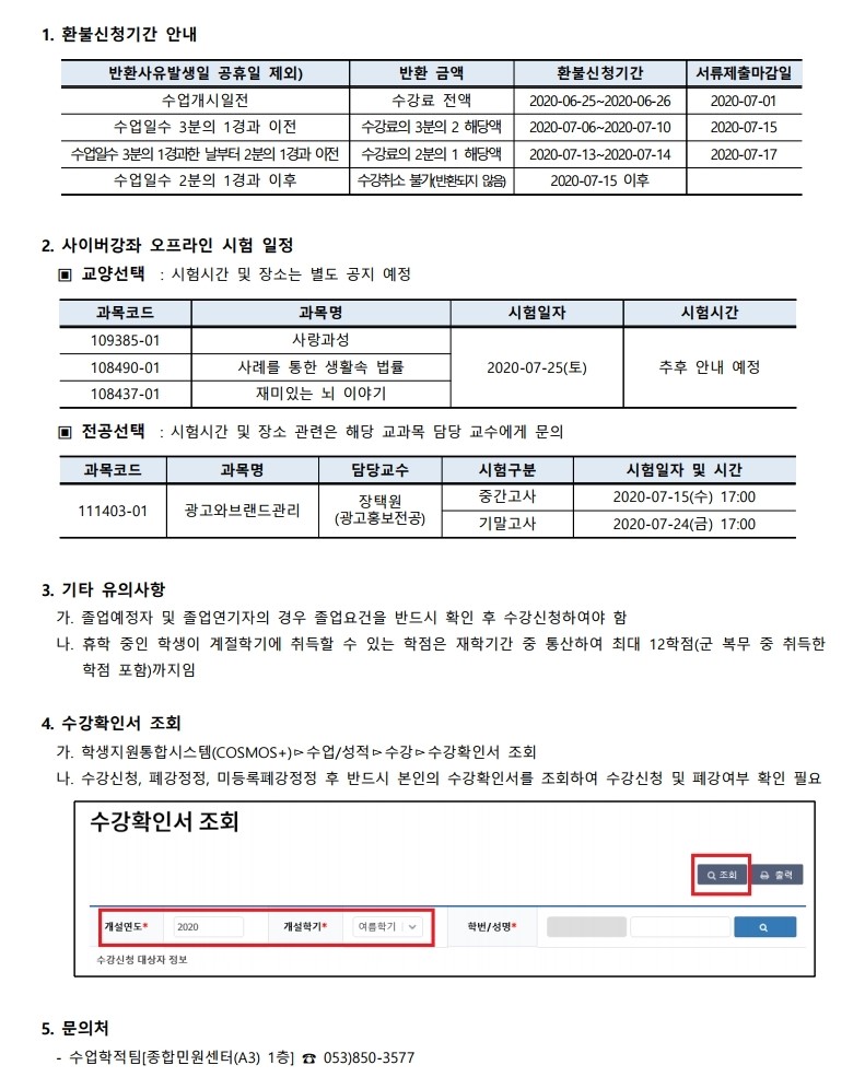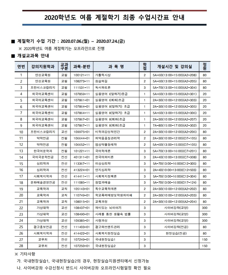 2020학년도 여름 계절학기 최종 시간표 안내