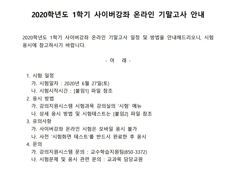 2020학년도 1학기 사이버강좌 온라인 기말고사 안내