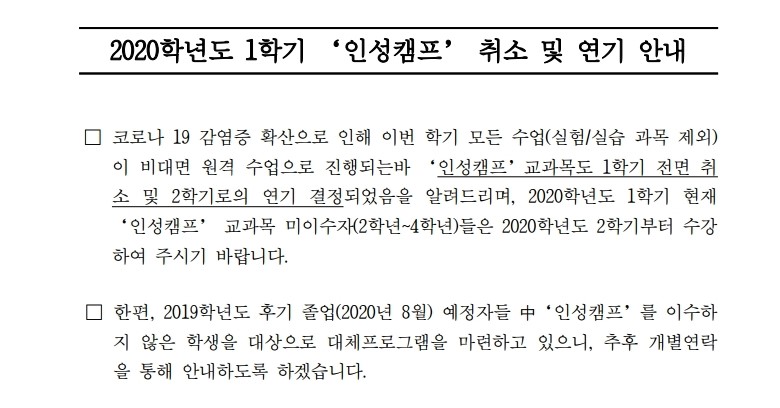 2020학년도 1학기 ‘인성캠프’ 취소 및 연기 안내