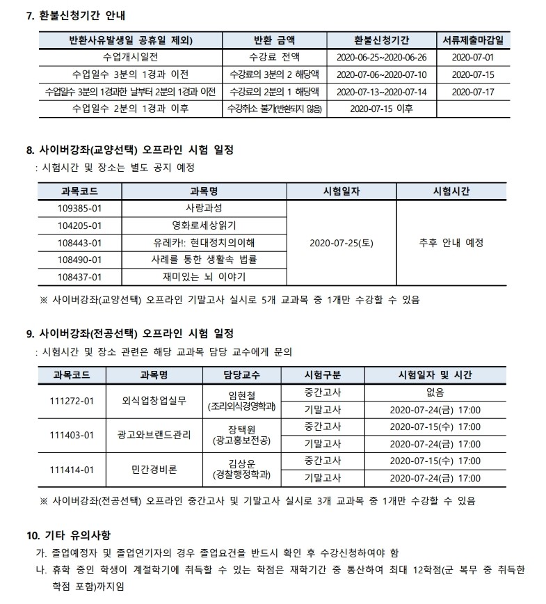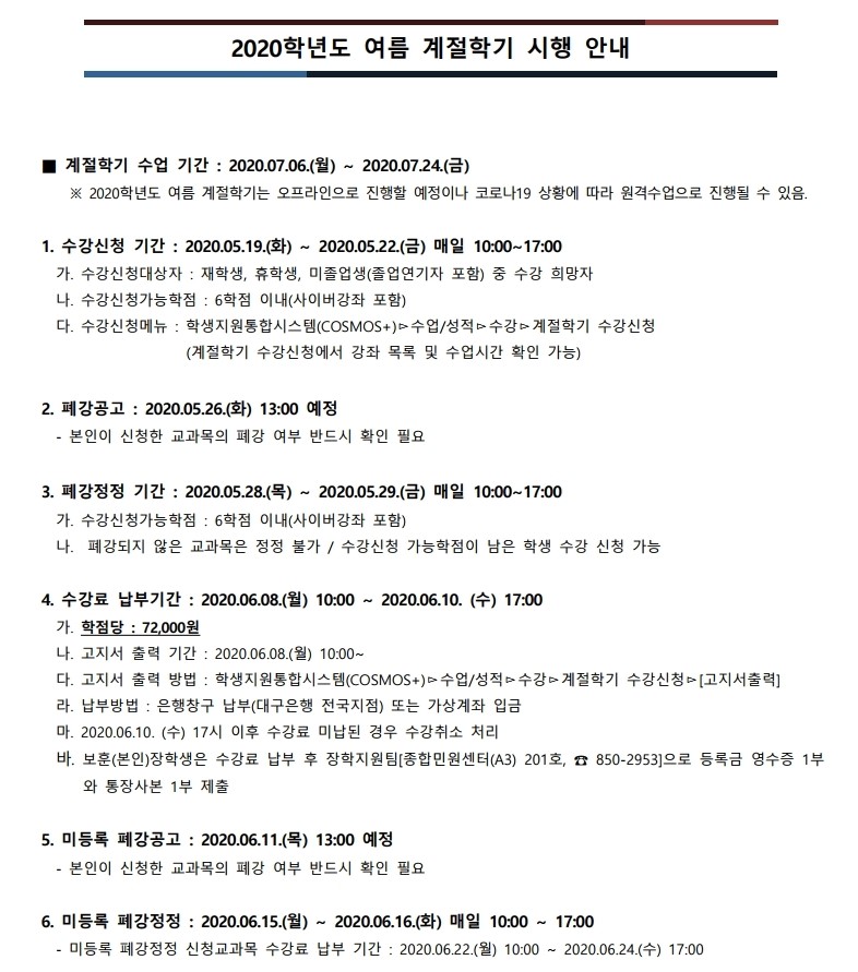 2020학년도 여름 계절학기 시행 안내