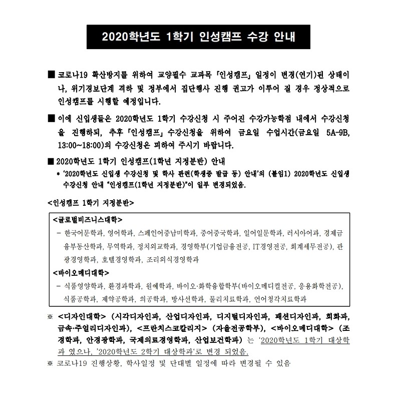 2020학년도 1학기 인성캠프 수강 안내(일정 변경)