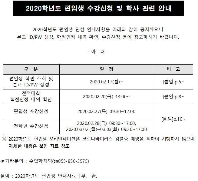 2020학년도 편입생 수강신청 및 학사 관련 안내