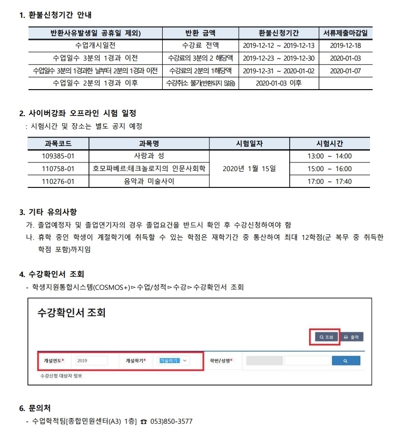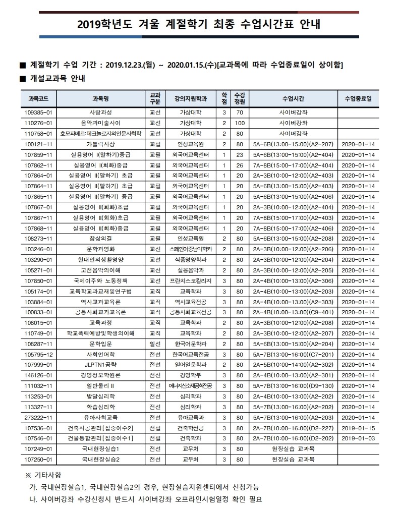 2019학년도 겨울 계절학기 최종수업시간표 안내