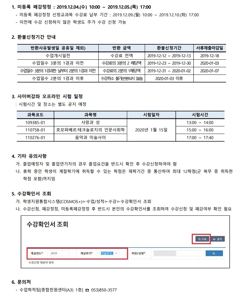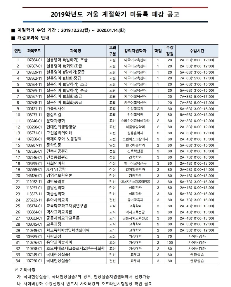 2019학년도 겨울 계절학기 미등록폐강공고(개설교과목 안내)