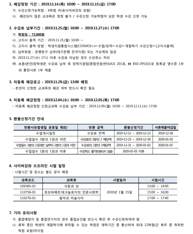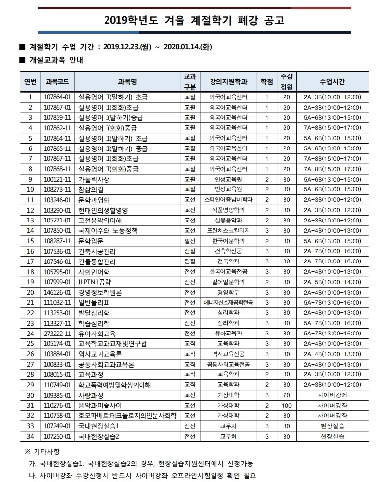 2019학년도 겨울 계절학기 폐강공고
