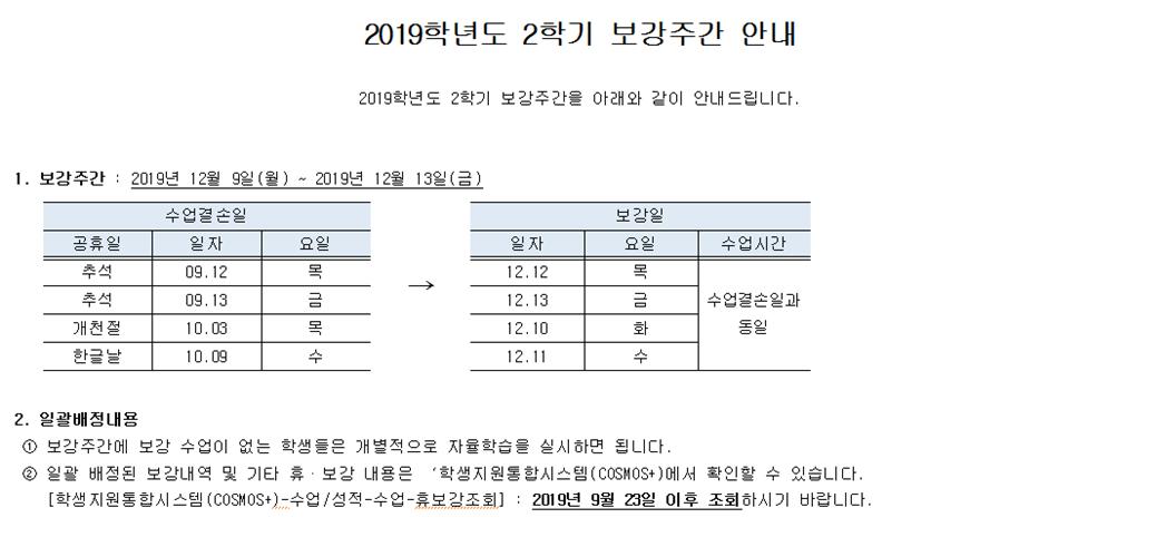 2019학년도 2학기 보강주간 안내