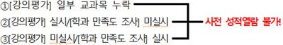 가. 수강중인 강의평가 대상 교과목 전체에 대한 [강의평가]와 더불어 [학과 만족도 조사]까지 모두 완료하여야 성적정정기간 동안 성적열람이 가능합니다.